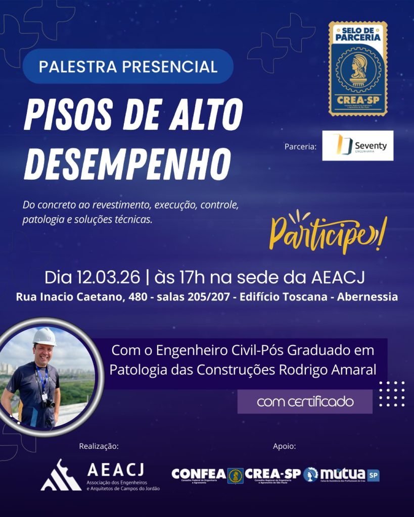 No dia 12 de março, às 17h na sede da AEACJ, a Associação promove uma palestra presencial sobre Pisos de Alto Desempenho, abordando desde o concreto e revestimento até execução, controle, patologias e soluções técnicas. O encontro será conduzido pelo Engenheiro Civil Rodrigo Amaral, pós-graduado em Patologia das Construções, trazendo experiências e orientações técnicas importantes para profissionais que atuam na área. Uma oportunidade de atualização profissional, troca de experiências e aprofundamento técnico sobre um tema cada vez mais presente nas obras contemporâneas.